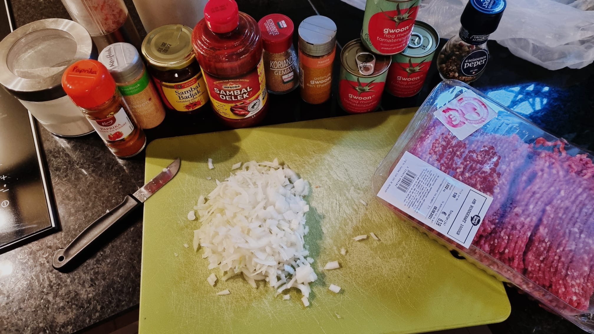 Verhit een scheutje olie in een koekenpan. Fruit de uien met de knoflook en een snuf peper en zout. Voeg de uienpoeder, knoflookpoeder, korianderpoeder, paprikapoeder, kerriepoeder, suiker, sambal badjak en sambal oelek toe. Bak dit ongeveer 30 seconden mee. Voeg dan het gehakt toe en bak dit gaar en goudbruin. Voeg de tomatenpuree en de bloem toe en bak dit 1 minuutje mee.
