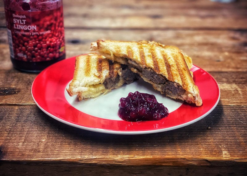 Smeer het brood in met boter en voeg de kaas toe, top dit af met een aantal Zweedse balletjes uit de roomsaus gevolgd door de bovenste snee brood.